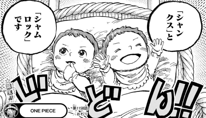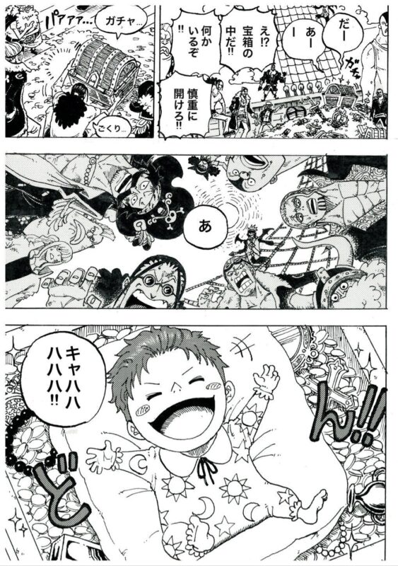 ここからドラゴンは、シャンクスを何かの宝箱に入れ、ガーリック聖から逃し、それをロジャーが拾ったのだと思われるため、ロジャー海賊団が宝箱の中から赤ん坊のシャンクスを発見した、という過去の描写と見事に繋がります。